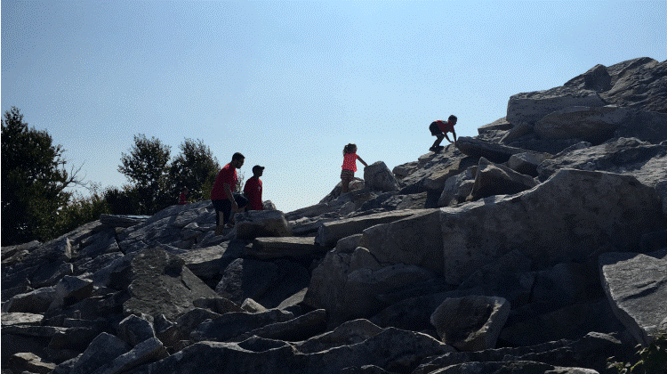 There are two different trails, both less than a half-mile. We followed the Hawk Trail, marked by orange bird silhouettes, and reached the top within 20 minutes or so, including the inevitable stops to inspect a wandering bug or interesting leaf. The trail is steep and rocky which was a fun change from the gentler nature trails my kids are used to, but the short distance kept the hike very do-able. The trails lead to a large outcrop of rocks and boulders, which is where you can watch for birds.