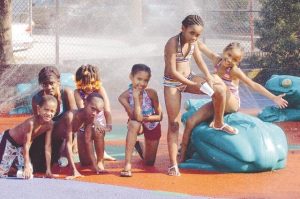 Children leap and squeal with delight when four large spitting frogs pelt them with water.